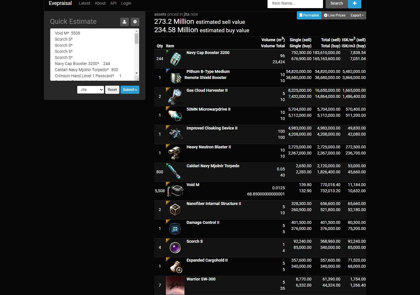 Make sure the drop down is set to Jita, and then press the blue submit button. You will get a screen like the following: