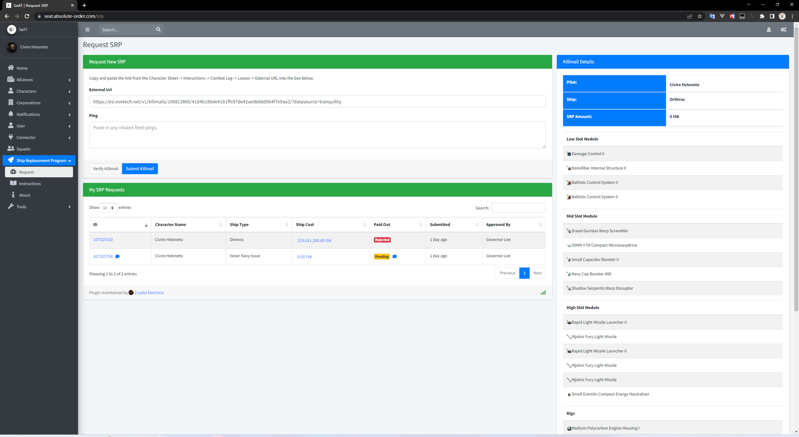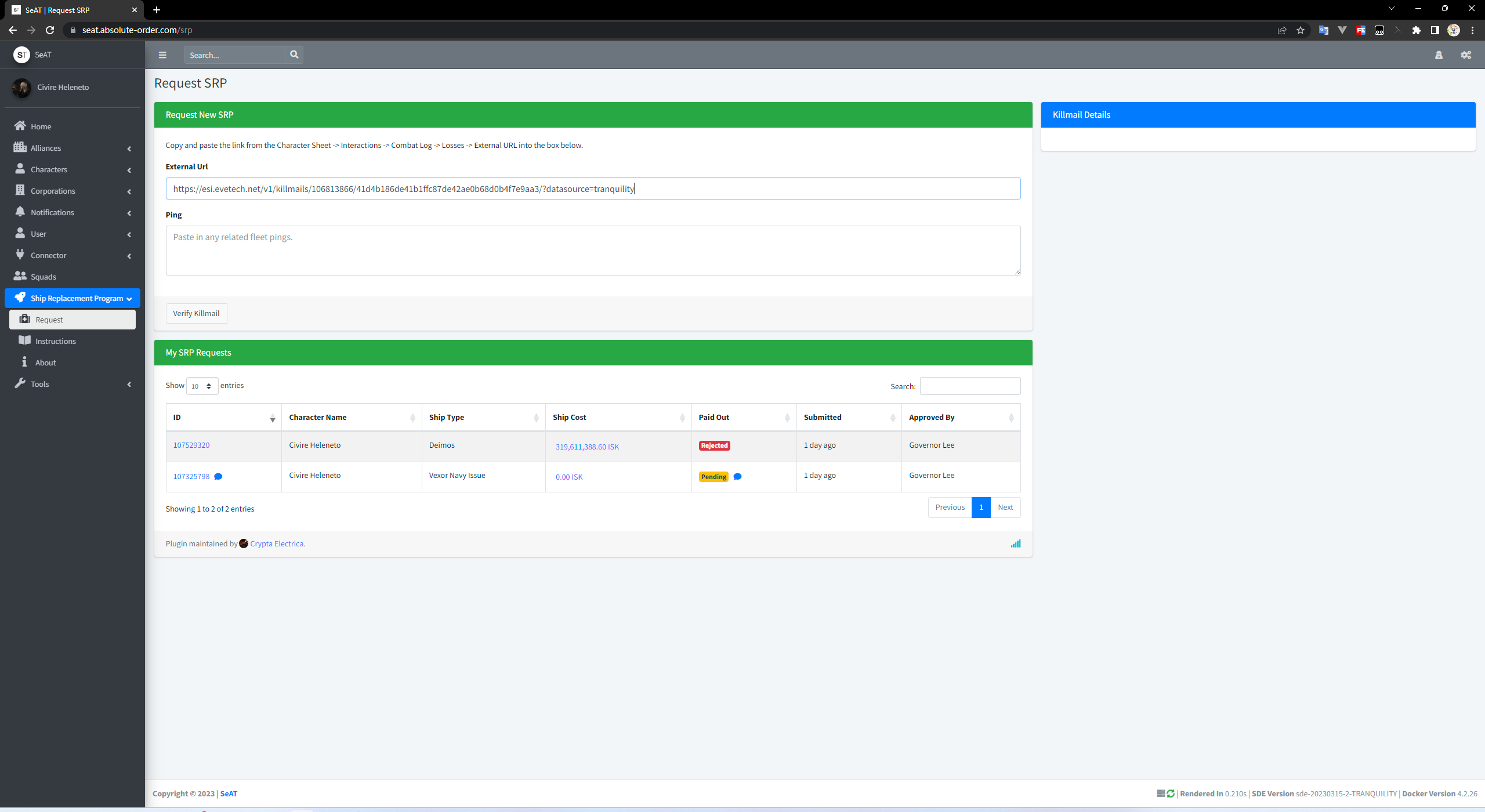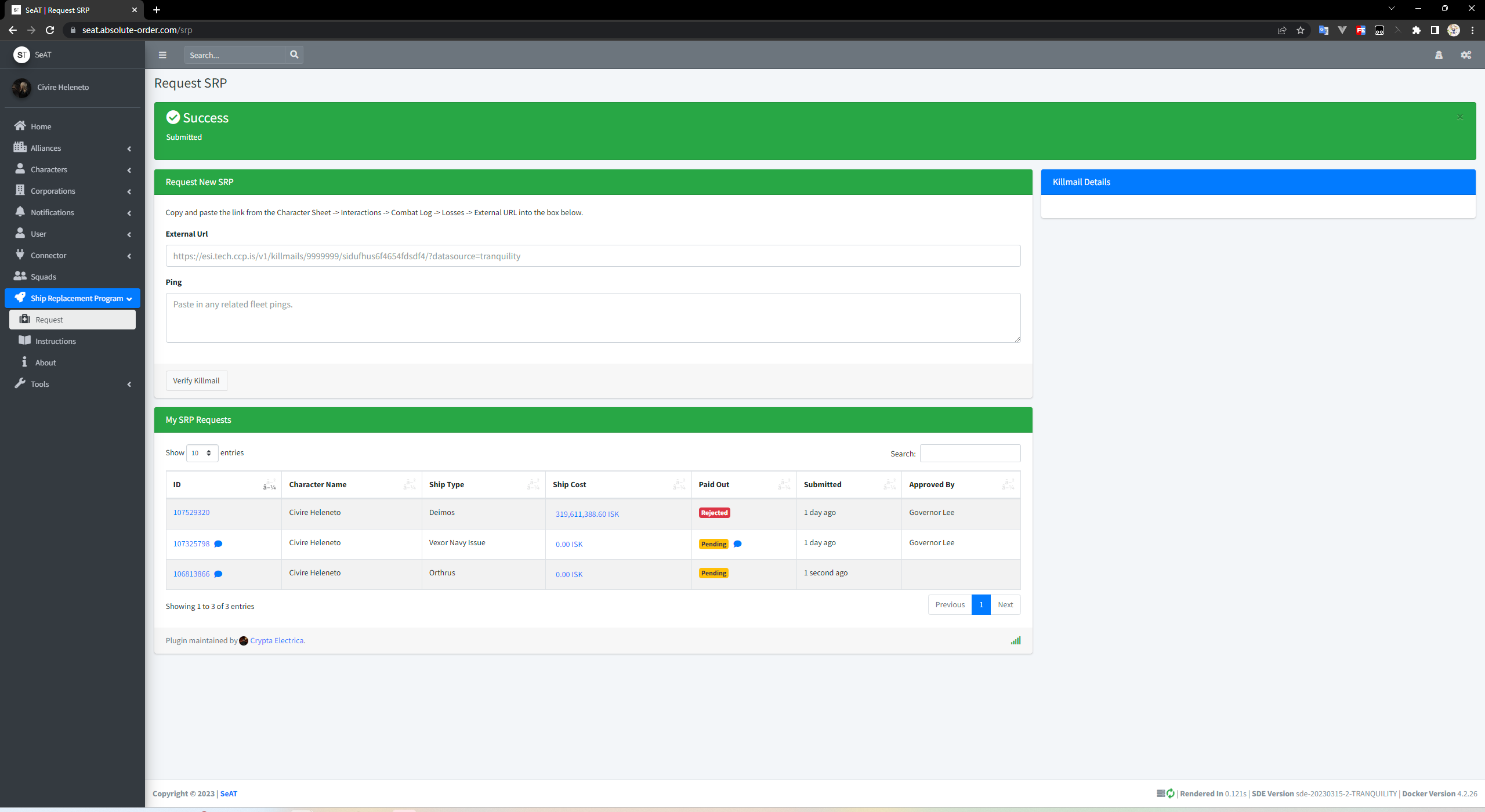 - Open the request page, and we will find that the page is divided into three major blocks Legend, from From left to right are, RequesNew SRP, My SRP Requests, and Killmail Details.
