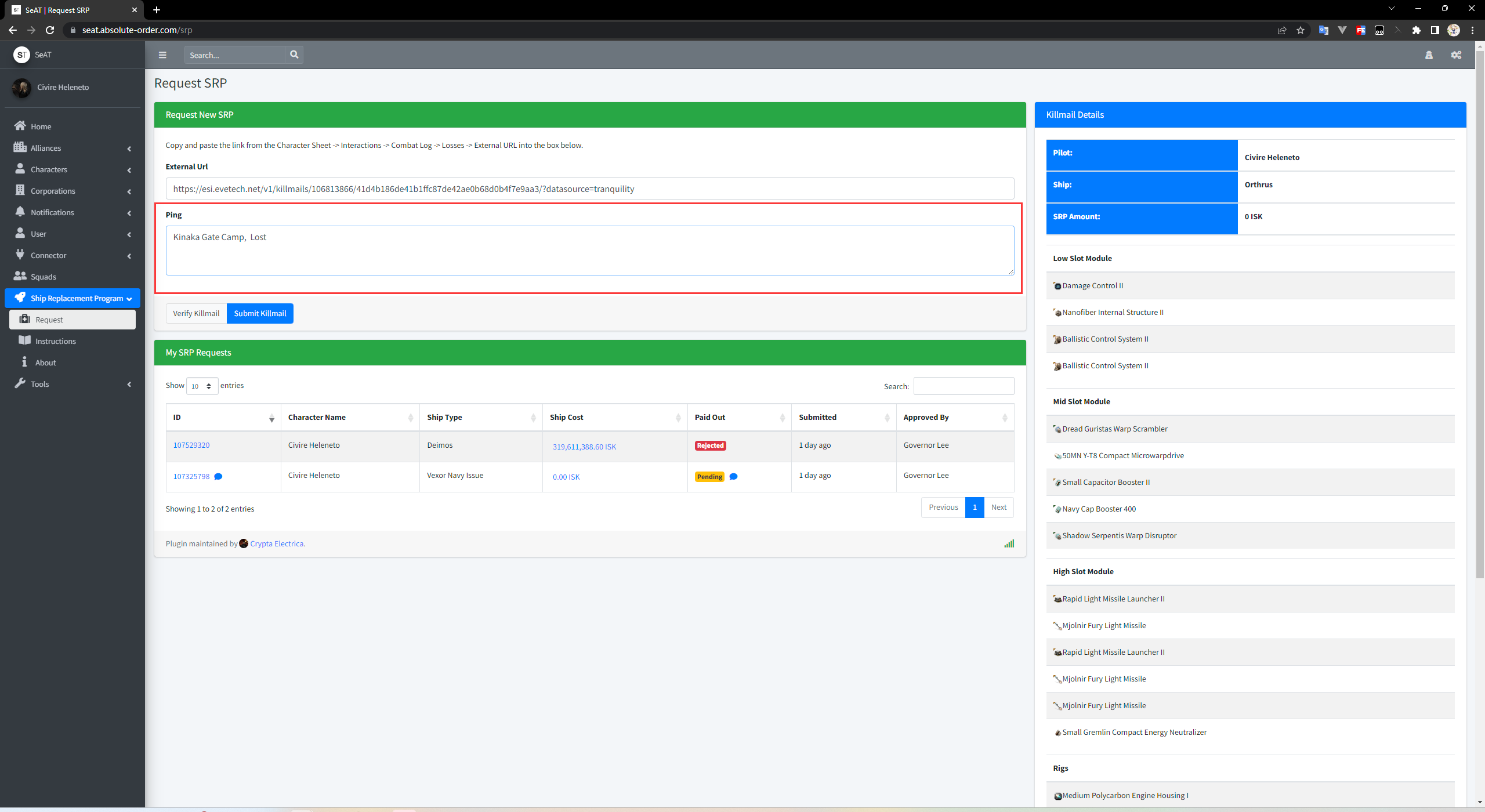 - The SRP applicant and the person on Killmail must be the same character, that is, your killmail’s in-game ID must match the Seat’s ID. Substituting applications for others or applicationfor small ones instead of large ones are not accepted. If not we will reject the SRP request