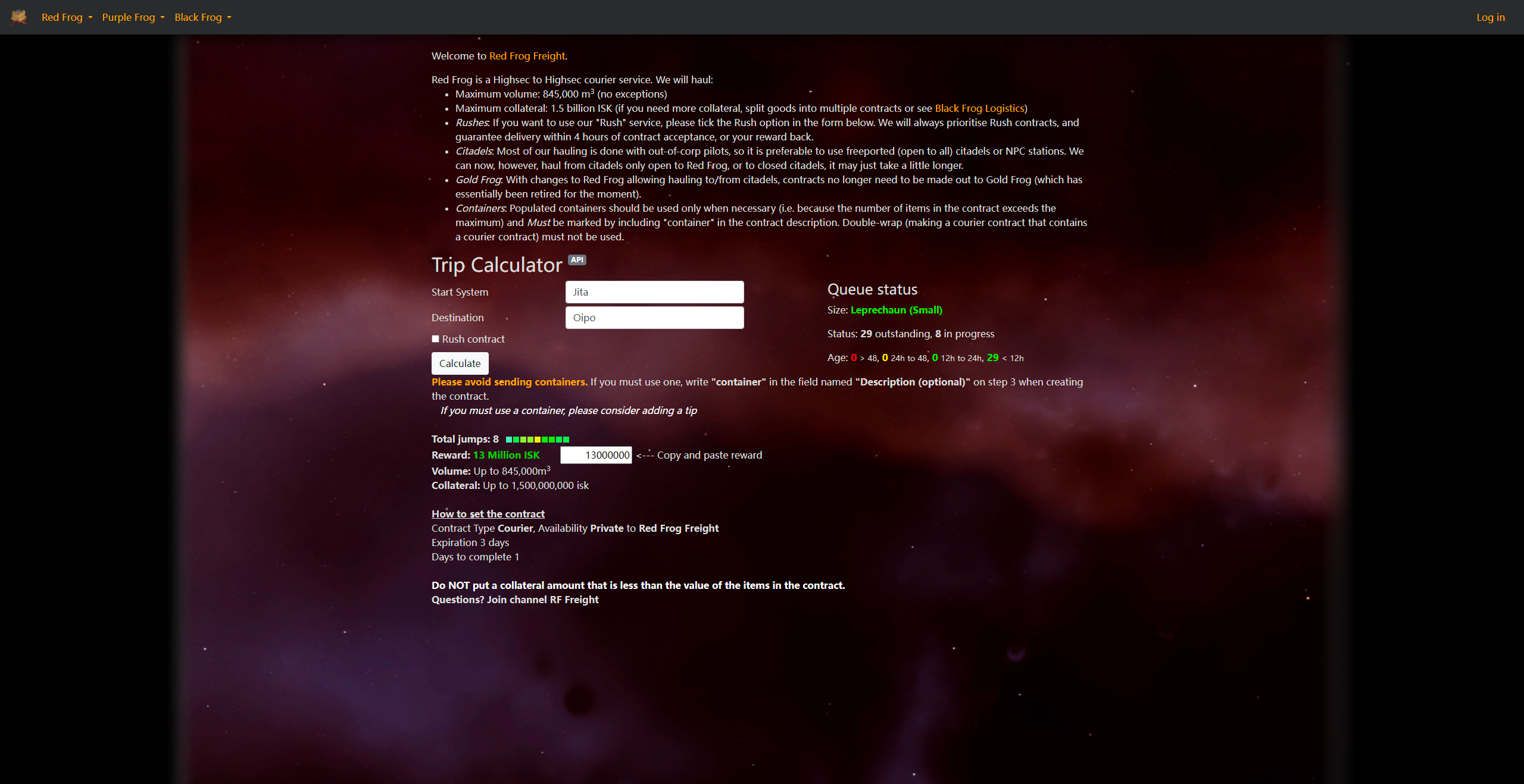 Then you find 10Million is the price, volume is the same, up to 845,000 m3 Collateral : 500Million ISK instead of 1.5B (If contract failed, you will get 500million ISK, so please do not put more than 500Million worth stuffs) Expiration : 7 Days Days to complete : 1 Day Contract to ‘Absolute Order XL’ instead of ‘Red Frog Freight’.